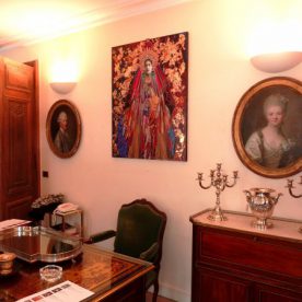 10 nouvelles toiles créées pour la plupart en 2011… Sur le thème des portraits et bijoux de reines, l’artiste présente une galerie de portraits dont les protagonistes, directement issus de ce que j’appelle « mon panthéon personnel » sont des princesses oubliées, des reines sans couronne, une impératrice de l’exil, un infant détrôné. Ainsi, la Comtesse de Paris, la Shabanou, la princesse de Kent, nouvellement parées, habillées et transposées dans un univers onirique où le décor fantasmé d’un château le dispute à la sobriété d’un fond monochrome travaillé à l’acrylique trouvent une nouvelle dimension…