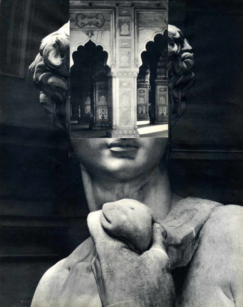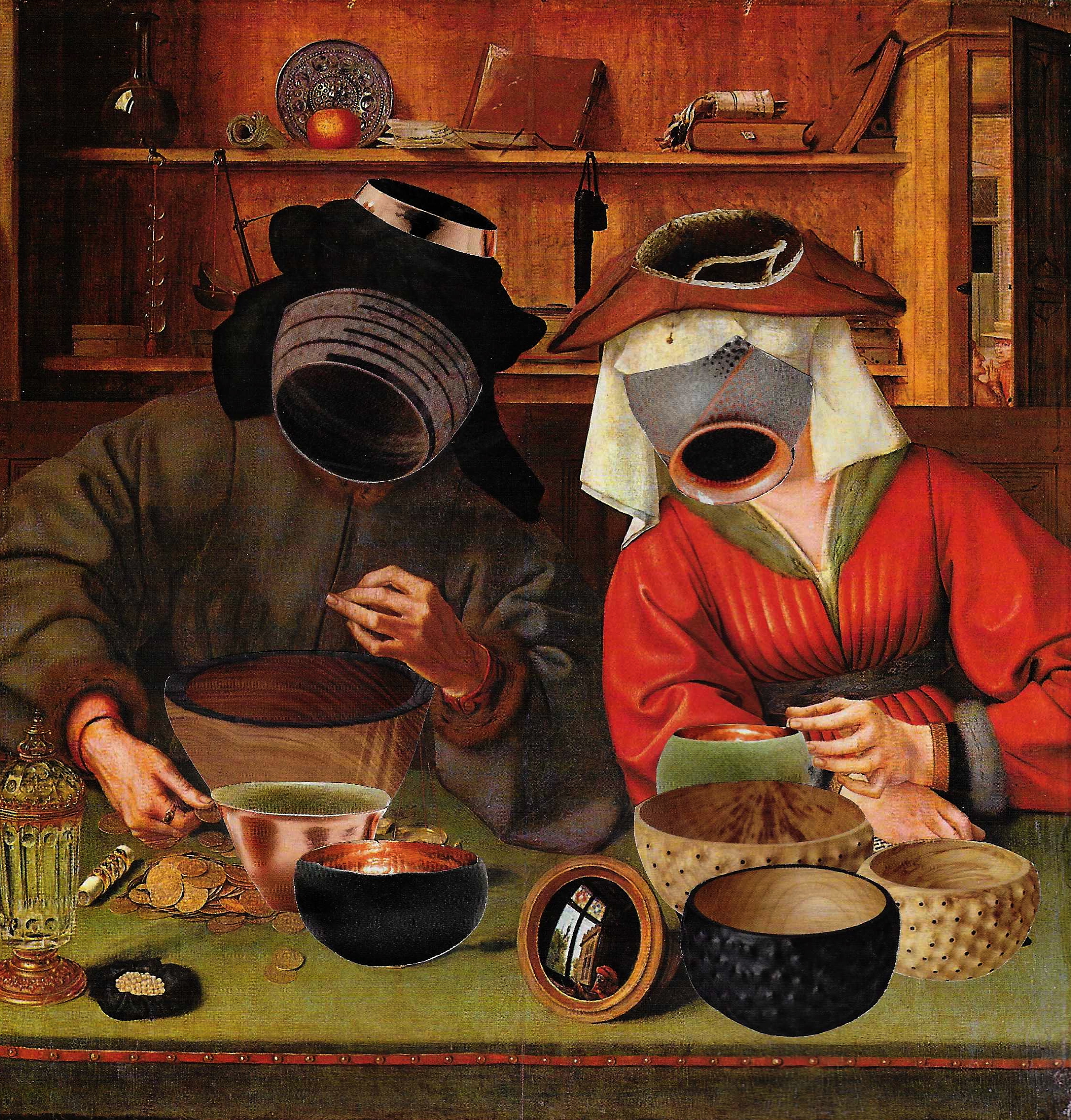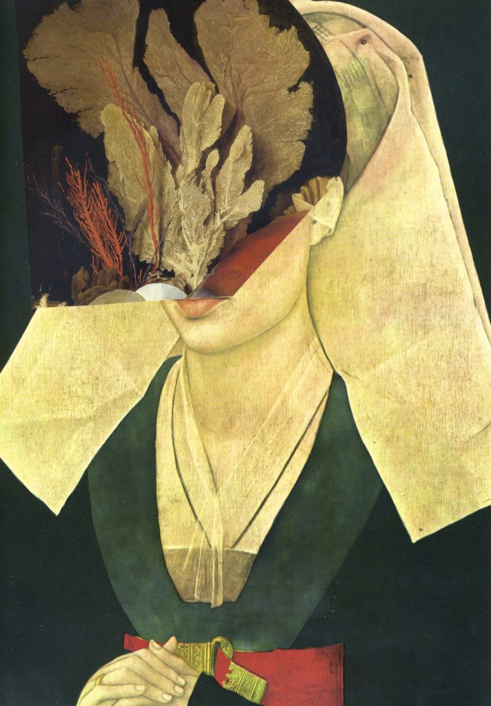 Collage sur panneau de bois, crâne d’oiseau, 61 x 81 cm